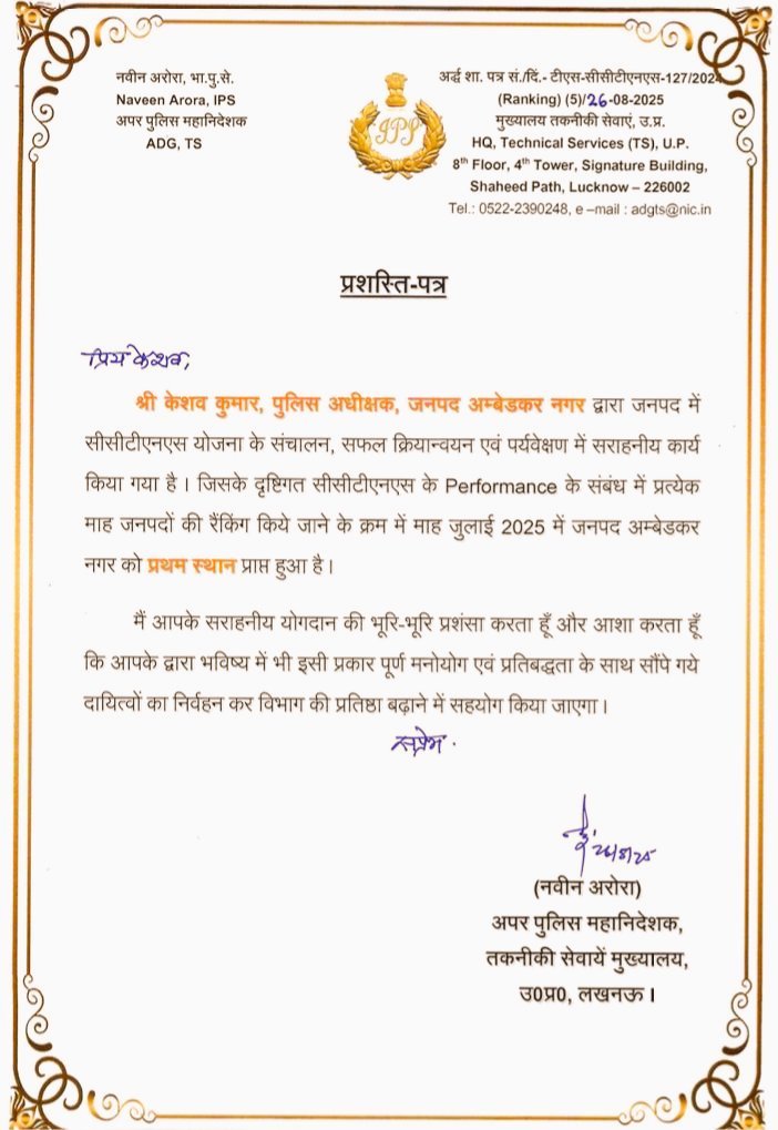 एडीजी ने अपने प्रशस्ति पत्र में उल्लेख किया कि केशव कुमार द्वारा किया गया कार्य सराहनीय है और भविष्य में भी इसी प्रकार पूर्ण निष्ठा एवं प्रतिबद्धता से दायित्वों का निर्वहन करते हुए विभाग की प्रतिष्ठा बढ़ाने में सहयोग मिलता रहेगा।इस उपलब्धि से अंबेडकरनगर पुलिस का मनोबल बढ़ा है और जिले के लोगों में भी गर्व की भावना है कि उनकी पुलिस ने प्रदेश स्तर पर सर्वोच्च स्थान हासिल किया है।