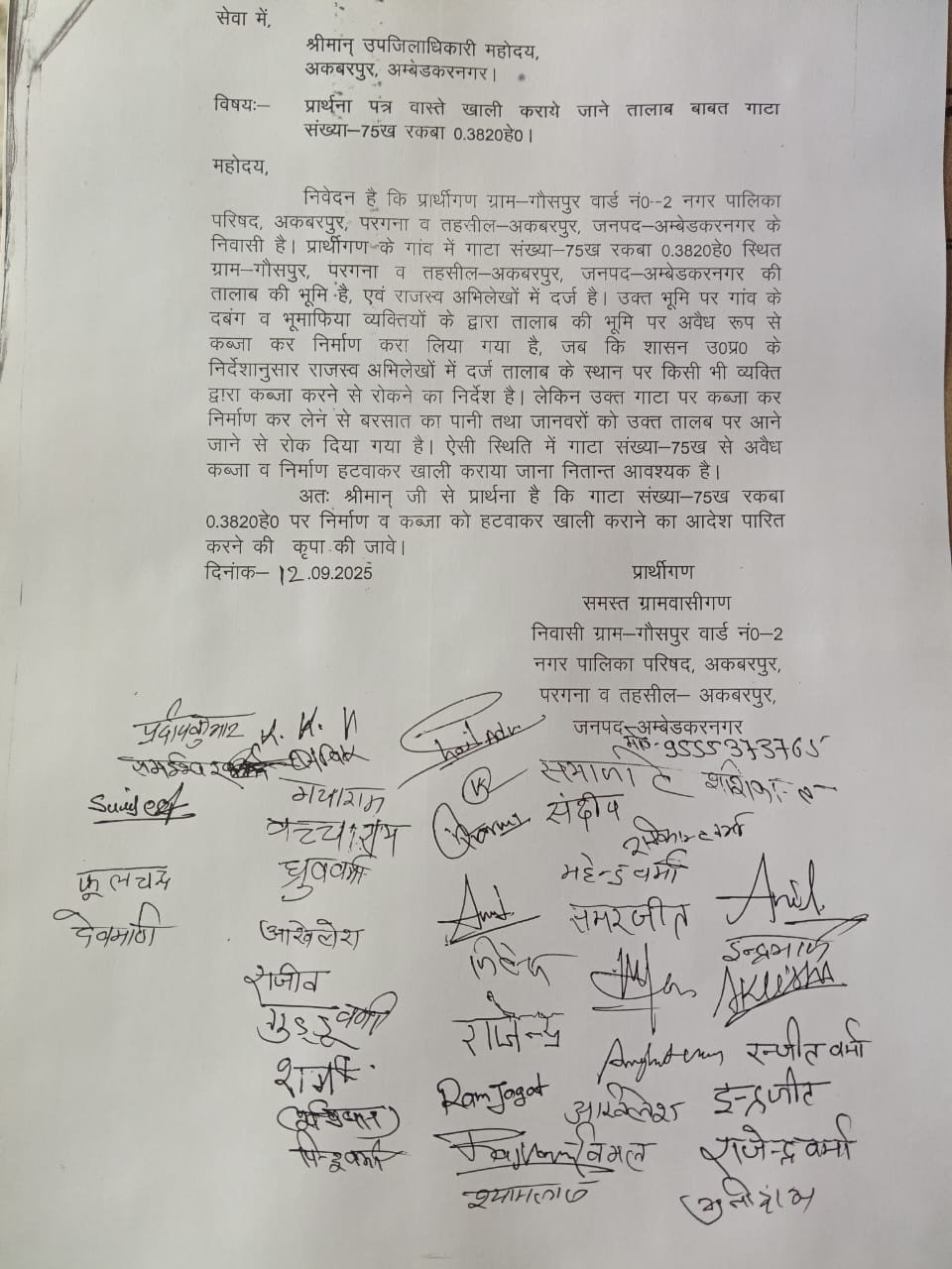 अम्बेडकरनगर नगर पालिका परिषद अकबरपुर, परगना व तहसील अकबरपुर अंतर्गत ग्राम–गौसपुर वार्ड नंबर 2 के ग्रामीणों ने जिला प्रशासन को प्रार्थना पत्र सौंपकर गाटा संख्या–75ख, रकबा 0.382080 हे. पर अवैध कब्ज़ा हटवाने की मांग की है।ग्रामीणों का कहना है कि यह भूमि राजस्व अभिलेखों में तालाब के रूप में दर्ज है और पूरे गाँव के जलभराव एवं निकासी का एकमात्र स्रोत है। बावजूद इसके कुछ व्यक्तियों द्वारा तालाब की भूमि पर पक्का निर्माण कार्य कराया जा रहा है। ग्रामीणों का आरोप है कि प्रशासन की नज़र के सामने तालाब की जमीन पर कब्ज़ा जमाया जा रहा है, जिससे गाँव में जलभराव की समस्या गंभीर रूप ले सकती है।ग्रामीणों ने अपने प्रार्थना पत्र में स्पष्ट किया है कि गाटा संख्या–75ख पर किया गया निर्माण कार्य अवैध है और इसे तत्काल हटवाया जाना आवश्यक है। साथ ही प्रशासन से मांग की है कि तालाब की भूमि को अतिक्रमण मुक्त कराकर पूर्व की भांति संरक्षित किया जाए, ताकि आने वाले दिनों में जलभराव व पर्यावरणीय समस्या से बचा जा सके।इस प्रार्थना पत्र पर ग्रामीणों ने सामूहिक हस्ताक्षर कर ज़िला प्रशासन से कड़ा कदम उठाने की मांग की है।