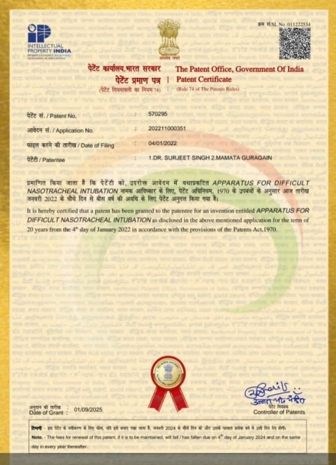 इस डिवाइस को भारत सरकार ने 1 सितंबर 2025 को पेटेंट प्रदान किया, जिसके लिए डॉ. सुरजीत ने 4 जनवरी 2022 को आवेदन किया था।यह डिवाइस जटिल सर्जरी के दौरान मरीजों की नाक से गले तक ट्यूब डालने की प्रक्रिया में नाजुक अंगों को होने वाली क्षति से बचाने में महत्वपूर्ण भूमिका निभाएगी। एनेस्थीसिया के क्षेत्र में यह खोज मरीजों की सुरक्षा और सर्जरी की सफलता दर को बढ़ाने में सहायक होगी।