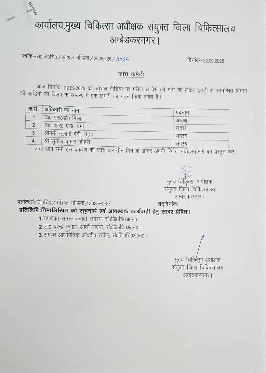 अंबेडकरनगर संयुक्त जिला चिकित्सालय अंबेडकरनगर में सोशल मीडिया पर मरीज से पैसे की मांग को लेकर उठे विवाद पर अब प्रशासन सक्रिय हो गया है। मुख्य चिकित्सा अधीक्षक ने इस मामले की गहन जांच कराने के लिए चार सदस्यीय समिति का गठन किया है।