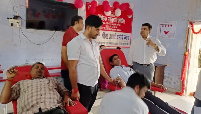 आज दिनांक 23/08/2025 को मीना आर्या धमार्थ न्याय के तत्वाधान में आर्य कन्या महाविद्यालय टांडा अम्बेडकरनगर में आयोजन किया गया,मुख्य अतिथि के रुप श्आनंद कुमार आर्य ने फीता काटकर रक्तदान शिविर कैम्प का शुभारम्भ किया और मनीष आर्य जी ने कहां रक्तदान एक सर्वश्रेष्ठ दान है,ये महादान है,आपके द्वारा किया गया रक्तदान एक नही अनेकों जीवन बचा सकता है,इसलिए नियमित रूप से रक्तदान कीजिए वहीं आर्य कन्या के प्रिंसिपल अरुण कुमार आर्य ने रक्तदान के बाद कहा कि हम जो रक्तदान करते है।